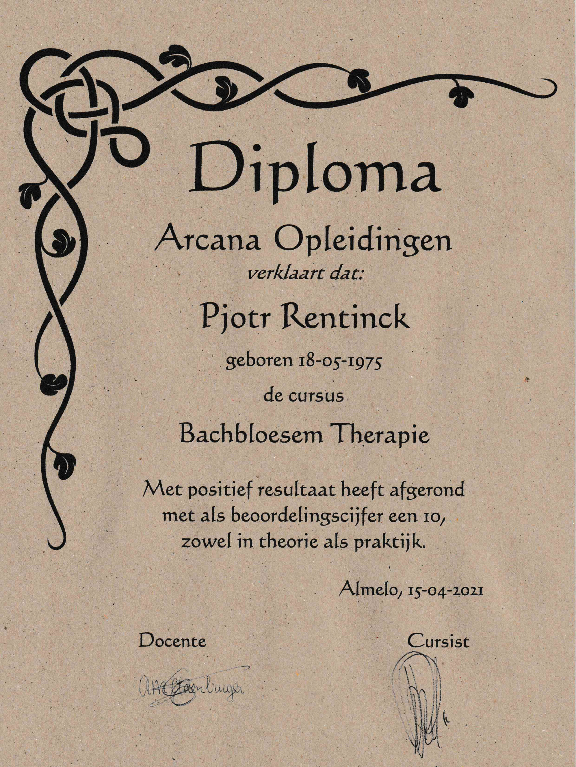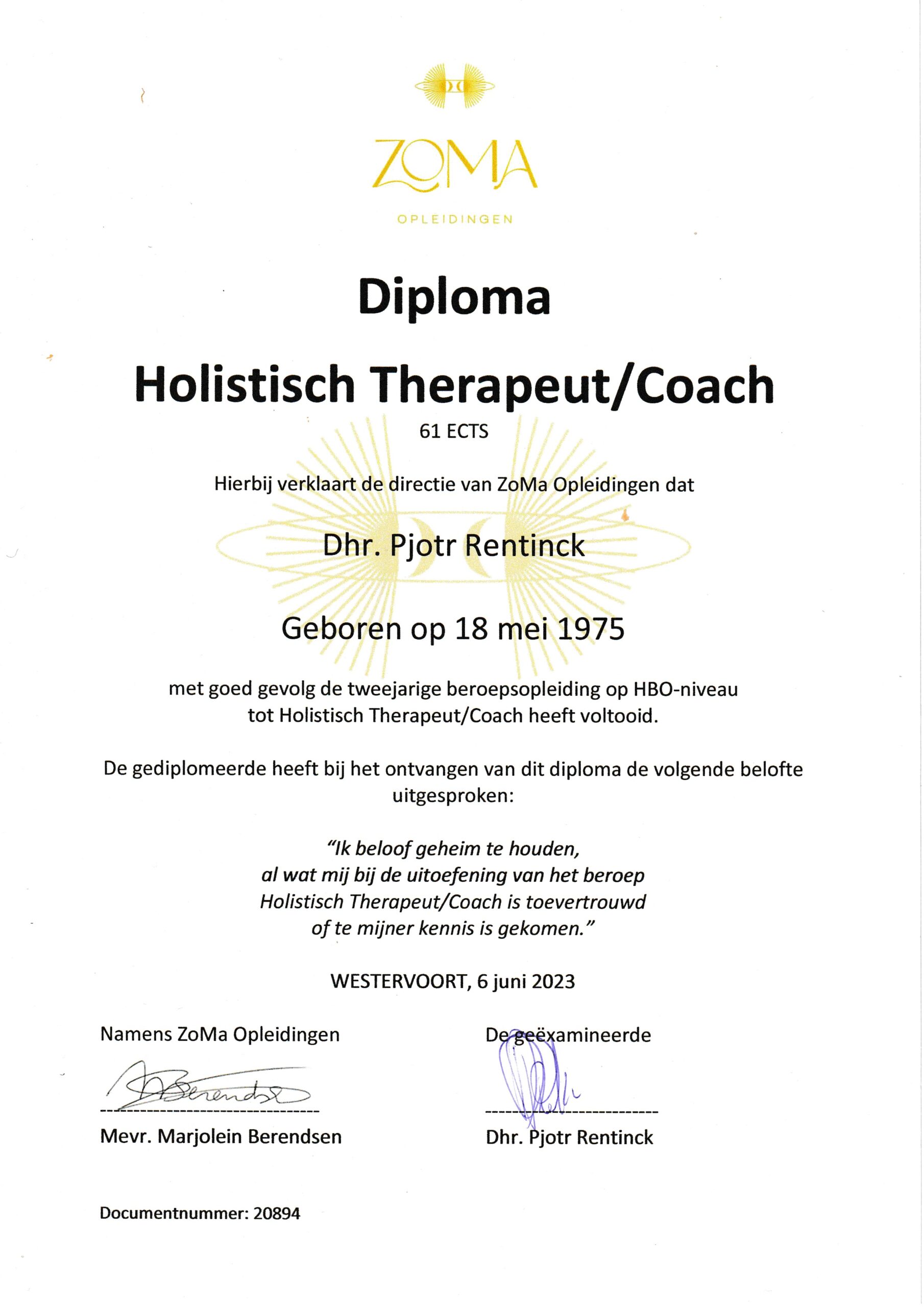 In 2023 heb ik de opleiding tot Holistisch Therapeut afgerond bij ZoMa Opleidingen. Een brede opleiding met diverse behandelmethodes Ook heb ik diverse cursussen gedaan op het gebied van o.a. Edelstenen, Bach Bloesem Therapie, Innerlijk kind werk (of: Innerlijk kind therapie) en NLP.