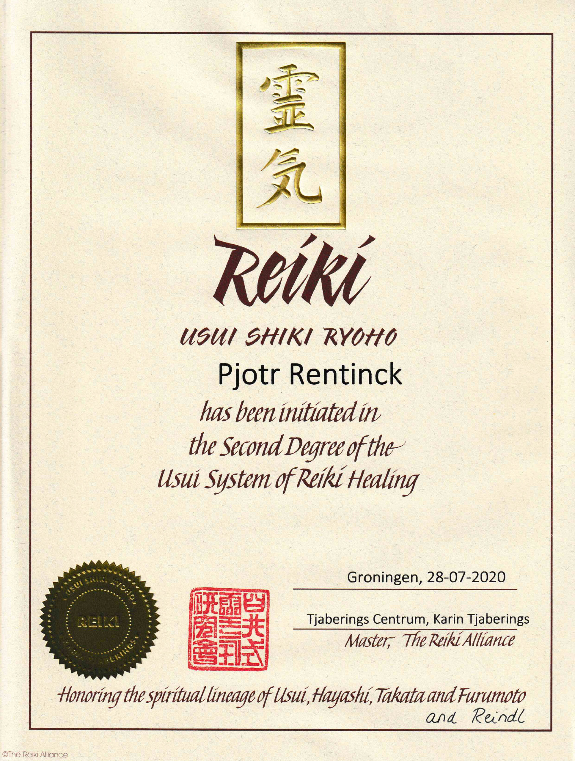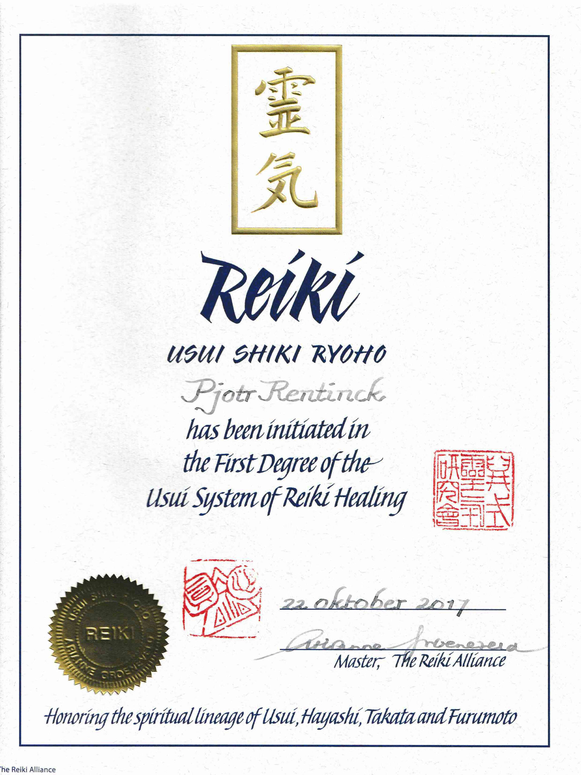 Na een driedaagse Reiki 1-opleiding in 2017 (Helios, Reiki Alliance) volgde ik in juli 2020 een tweedaagse Reiki 2-opleiding (Karin Tjaberings, Reiki Alliance). Beide volgens de traditionele technieken zoals overgedragen door mrs. Takata. Deze staan bekend als Usui Reiki, genoemd naar de grondlegger van Reiki: Mikao Usui.