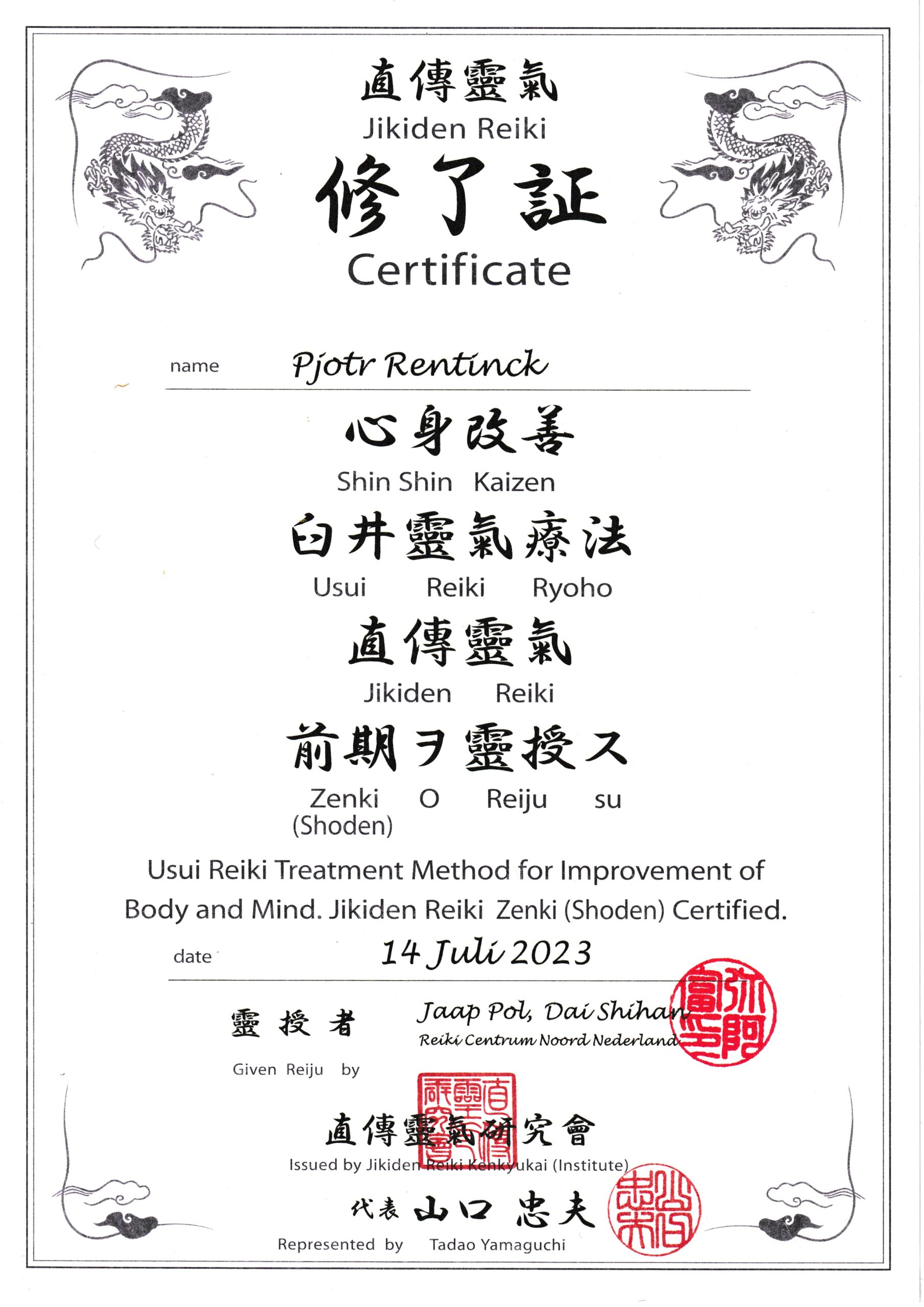 In 2023 heb ik de Japanse vorm van Reiki (Jikiden Reiki = originele Reiki) geleerd op het Shöden en Okuden niveau. Deze vorm van Reiki is doorgegeven in Japan en niet zo lang geleden daar herontdekt. Ook dit is Reiki uit het Usui systeem maar de energie wordt hierbij iets anders ingezet en is vrijwel alleen gericht op het verhelpen van klachten. Zowel lichamelijk als geestelijk.